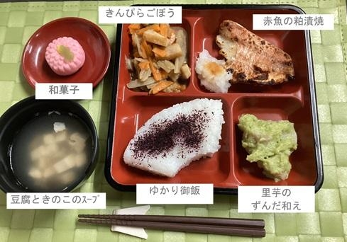 ゆかり御飯、赤魚の粕漬焼、きんぴらごぼう、里芋のずんだ和え、豆腐ときのこのスープ、和菓子を提供させていただきました。少し早めの敬老会の日の昼食のため、御飯は扇の型で抜き、仕切りのある器に盛り付けました。粕漬けは魚の臭みがなく、うま味があって塩味は控えめのやさしい味付けです。